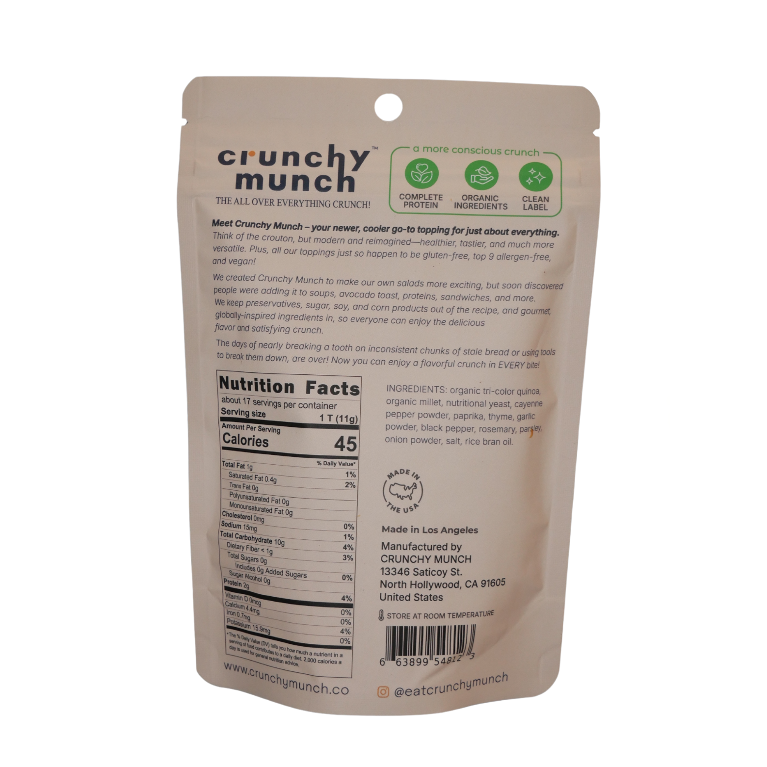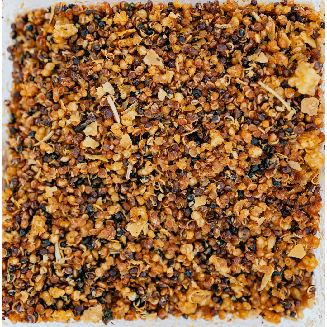 Ingredients: organic quinoa, organic millet, organic nutritional yeast, salt, cayenne pepper powder, paprika, thyme, garlic powder, black pepper, rosemary, parsley, onion powder, rice bran oil